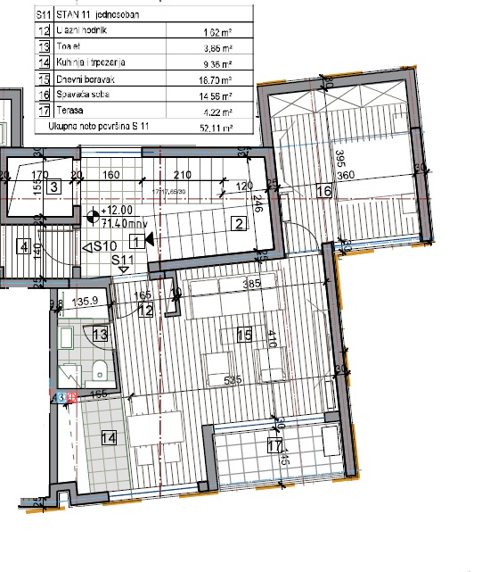 Апартаменты находятся на 5 этаже и состоят из коридора, ванной комнаты, кухни, совмещённой с гостиной, из которой есть выход на террасу, а также спальной комнаты.