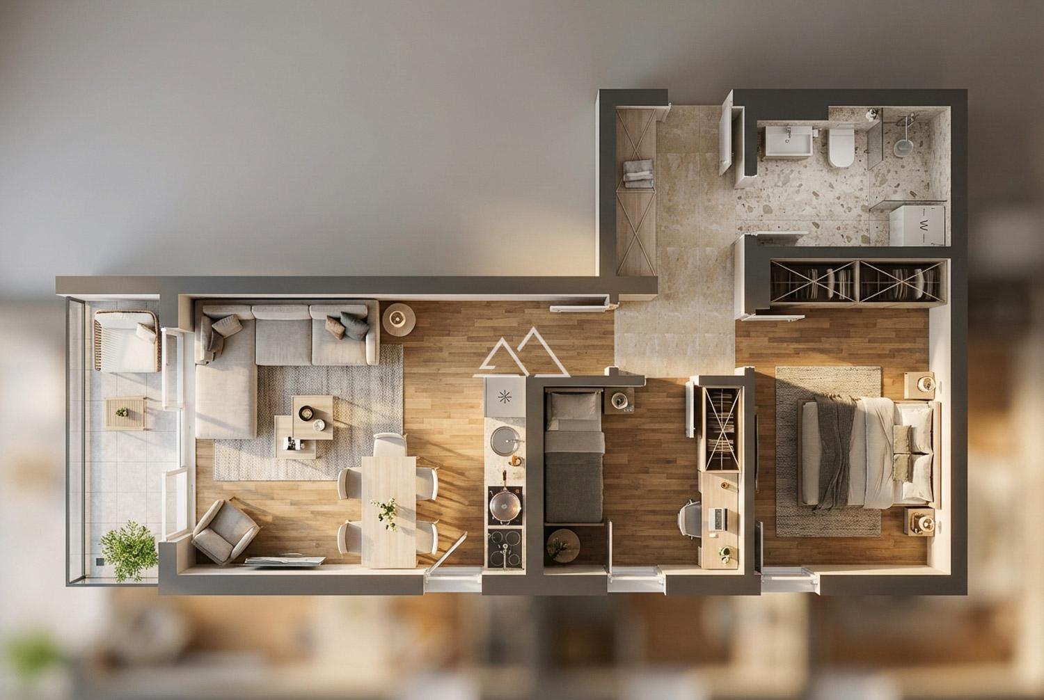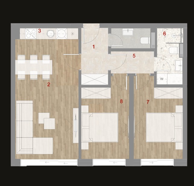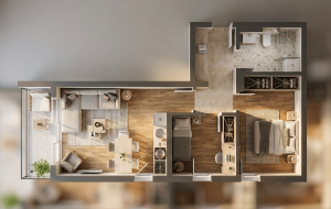Квартира состоит из коридора, гостиной, совмещенной с кухней, двух спален и ванной комнаты.