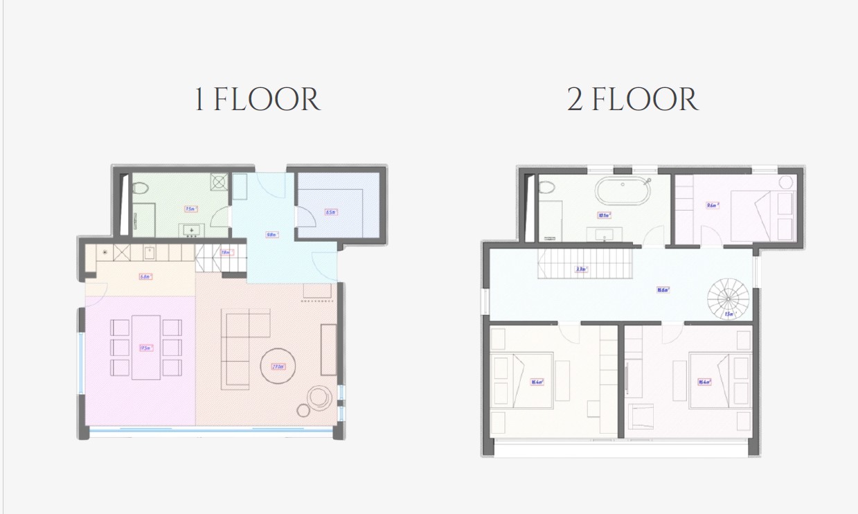 Вилла состоит из 2 этажей и включает в себя гостиную, 3 спальни, гардеробную, 2 ванные комнаты и эксплуатируемую кровлю. Панорамные окна создают ощущение пространства, позволяют наслаждаться прекрасными морскими видами, находясь у себя дома.